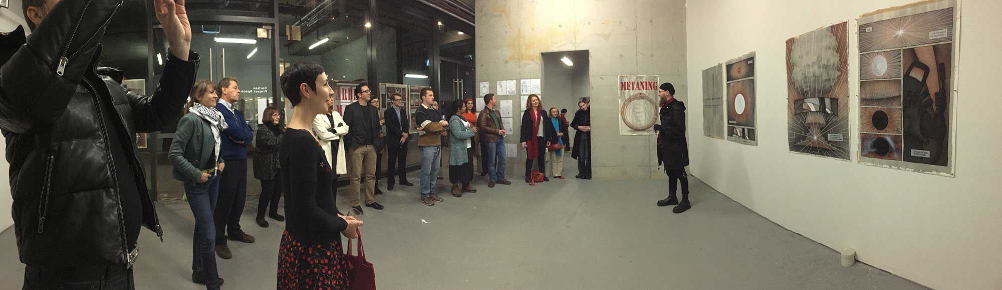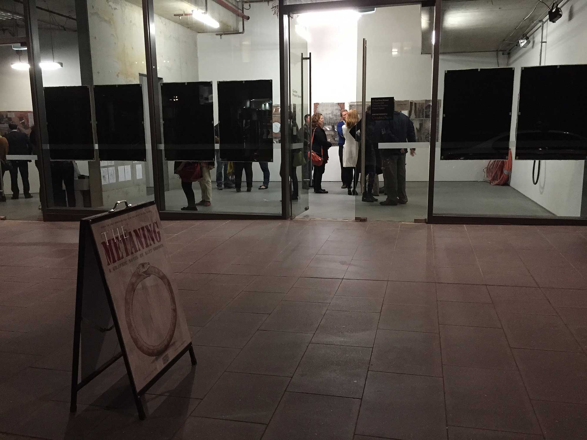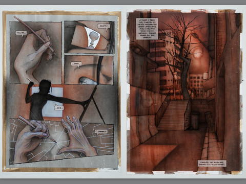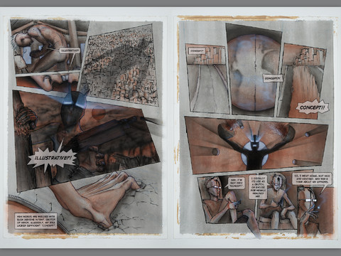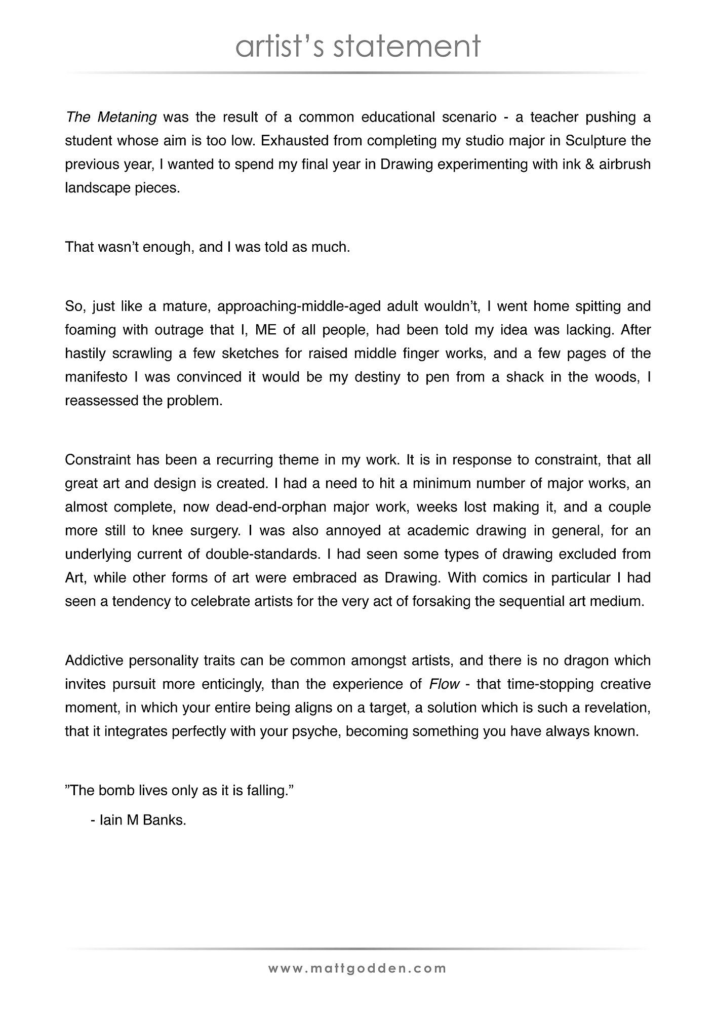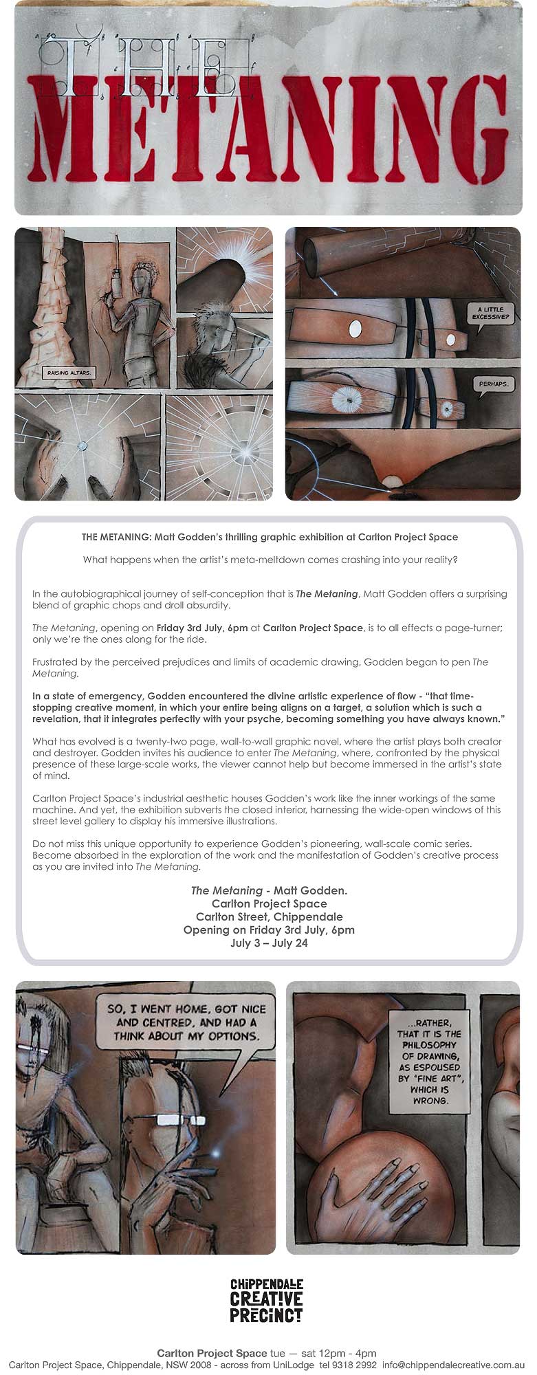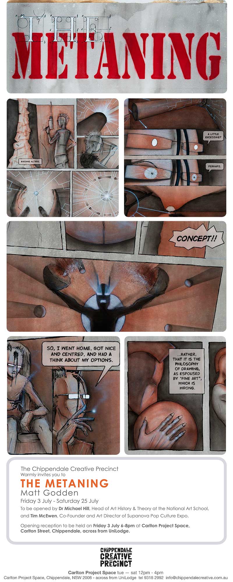 The Metaning is an art project by Matt Godden - a 22 page (including covers) gallery-wall-scale graphic novel, with pages approximately 113x82cm in size. To the best of our knowledge, having spoken with creators, publishers and academics specialising in Australian comics, this is the first work of this nature (a full-length, single-creator, wall-scale work) created in Australia, though we're happy to hear of preceeding works The work was created as a response to the difficulty faced when trying to come up with a project acceptable to the drawing department of a traditional art school (who, to be fair, assessed it quite highly). Narratively, The Metaning is an autobiographical journey through the events and decisions that lead to the creation of the work itself. It covers the struggle for legitimacy that comics & sequential art face, especially in the context of modern drawing practice, which seems to be able to regard almost anything as "drawing". The story is presented as an alternation between the real-world studio struggles of the artist, and the parallel internal fantasy universe of the artist as omnipotent destroyer and creator. An important aspect of the project, central to its nature as a meta-work, is that the eventual exhibition of the project had a performative aspect. It wasn't just a chance to see the original images in person, rather the exhibiton forms part of the argument of Comics as Fine Art, and all of those who attended the opening night, became in effect a part of the larger work, which was the performance of creating and exhibiting a work of comic art in a Fine Art context. The work is deliberately about trying to ride both sides of the divide between sincerity and cynicism, until there isn't really a distinction between them. It is simultaniously a cynical mechanism to tie together dispirate works into a single theme to fulfil a quota for an assessment event, and a sincere attempt to create a genuinely considered piece of art. To that end it has both an internal argument expressed within the text, and a structure in terms of the physical nature of the pages, how they were made, and how they were exhibited as a performative meta-work, that is intended to play within that realm of when parody becomes indistinguishable, due to the care and technical skill with which it is performed. Hopefully that sincerity of intent comes across within the work when read, rather than experienced, or participated within as an attendee of the exhibition. |
