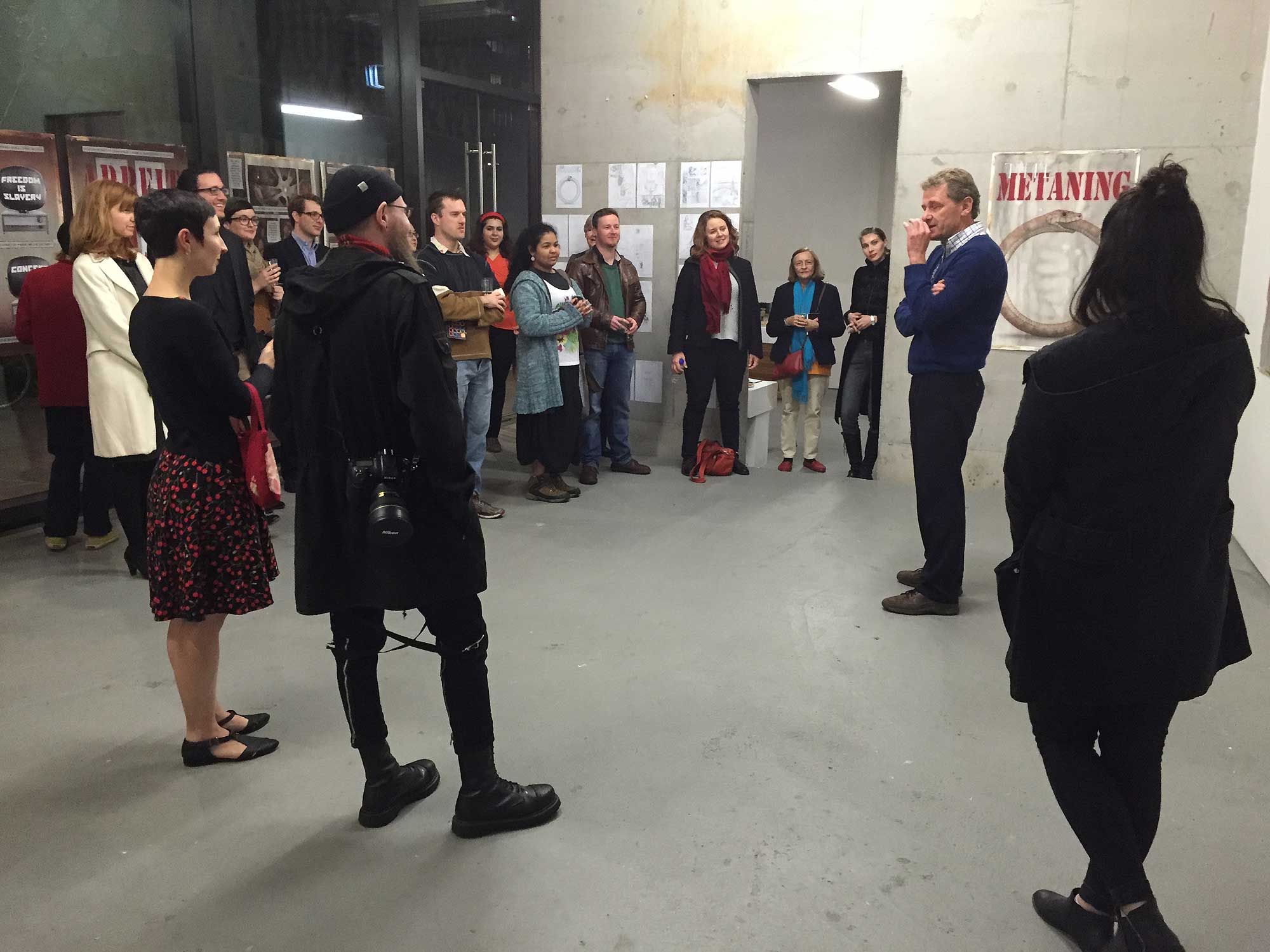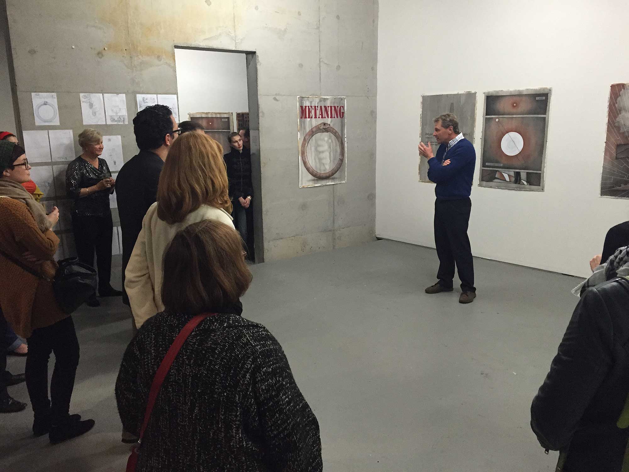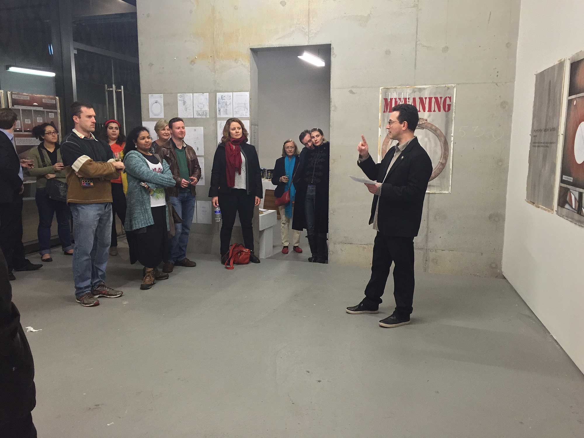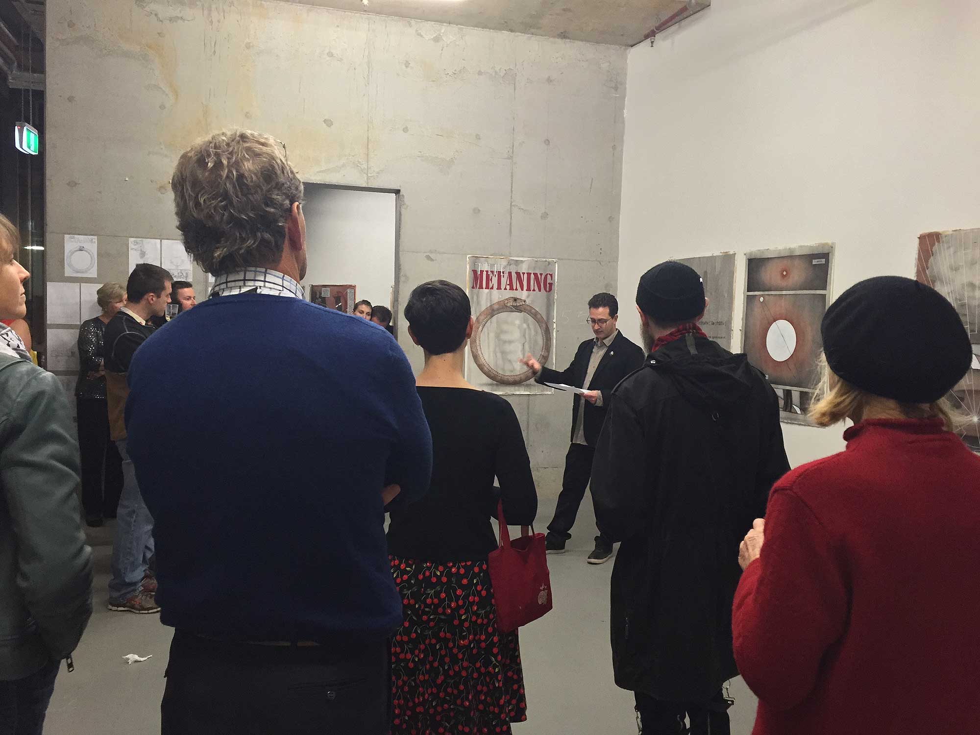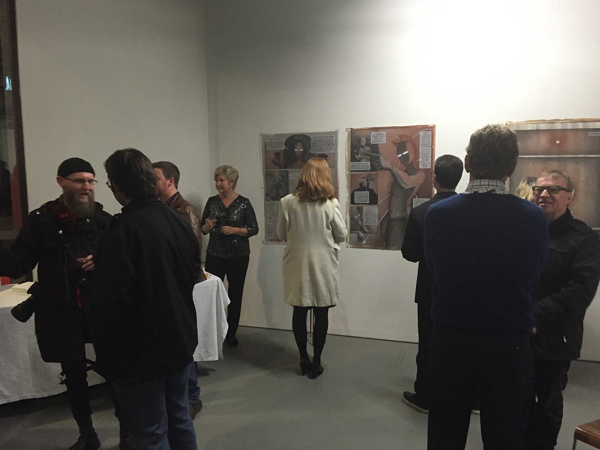 The Metaning is an art project by Matt Godden - a 22 page (including covers) gallery-wall-scale graphic novel, with pages approximately 113x82cm in size. To the best of our knowledge, having spoken with creators, publishers and academics specialising in Australian comics, this is the first work of this nature (a full-length, single-creator, wall-scale work) created in Australia, though we're happy to hear of preceeding works The work was created as a response to the difficulty faced when trying to come up with a project acceptable to the drawing department of a traditional art school (who, to be fair, assessed it quite highly). Narratively, The Metaning is an autobiographical journey through the events and decisions that lead to the creation of the work itself. It covers the struggle for legitimacy that comics & sequential art face, especially in the context of modern drawing practice, which seems to be able to regard almost anything as "drawing". The story is presented as an alternation between the real-world studio struggles of the artist, and the parallel internal fantasy universe of the artist as omnipotent destroyer and creator. An important aspect of the project, central to its nature as a meta-work, is that the eventual exhibition of the project had a performative aspect. It wasn't just a chance to see the original images in person, rather the exhibiton forms part of the argument of Comics as Fine Art, and all of those who attended the opening night, became in effect a part of the larger work, which was the performance of creating and exhibiting a work of comic art in a Fine Art context. The work is deliberately about trying to ride both sides of the divide between sincerity and cynicism, until there isn't really a distinction between them. It is simultaniously a cynical mechanism to tie together dispirate works into a single theme to fulfil a quota for an assessment event, and a sincere attempt to create a genuinely considered piece of art. To that end it has both an internal argument expressed within the text, and a structure in terms of the physical nature of the pages, how they were made, and how they were exhibited as a performative meta-work, that is intended to play within that realm of when parody becomes indistinguishable, due to the care and technical skill with which it is performed. Hopefully that sincerity of intent comes across within the work when read, rather than experienced, or participated within as an attendee of the exhibition. |